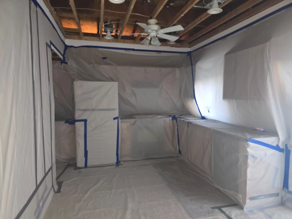 We isolate the work area using professional containment, HEPA filtration, negative air pressure, and proper signage.